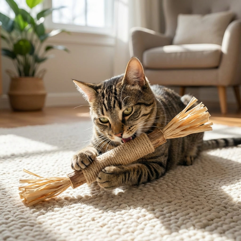 Silvervine aktiverer 80% af alle katte — selv dem der ikke reagerer på catnip. Din kat vil selv opsøge sine tandpinde.