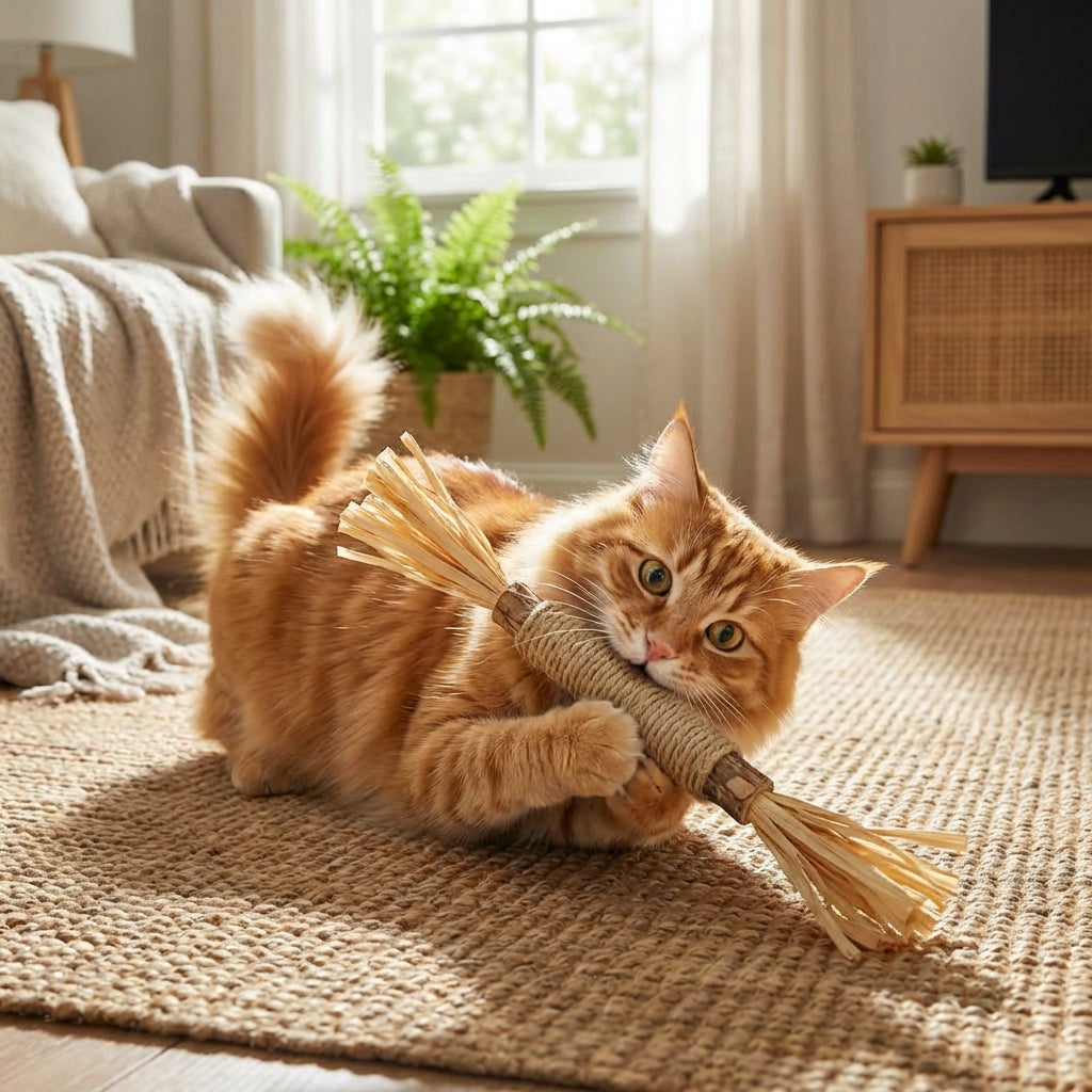 Katten gnaver, leger og ruller — fibrene skraber plak af tænderne imens.